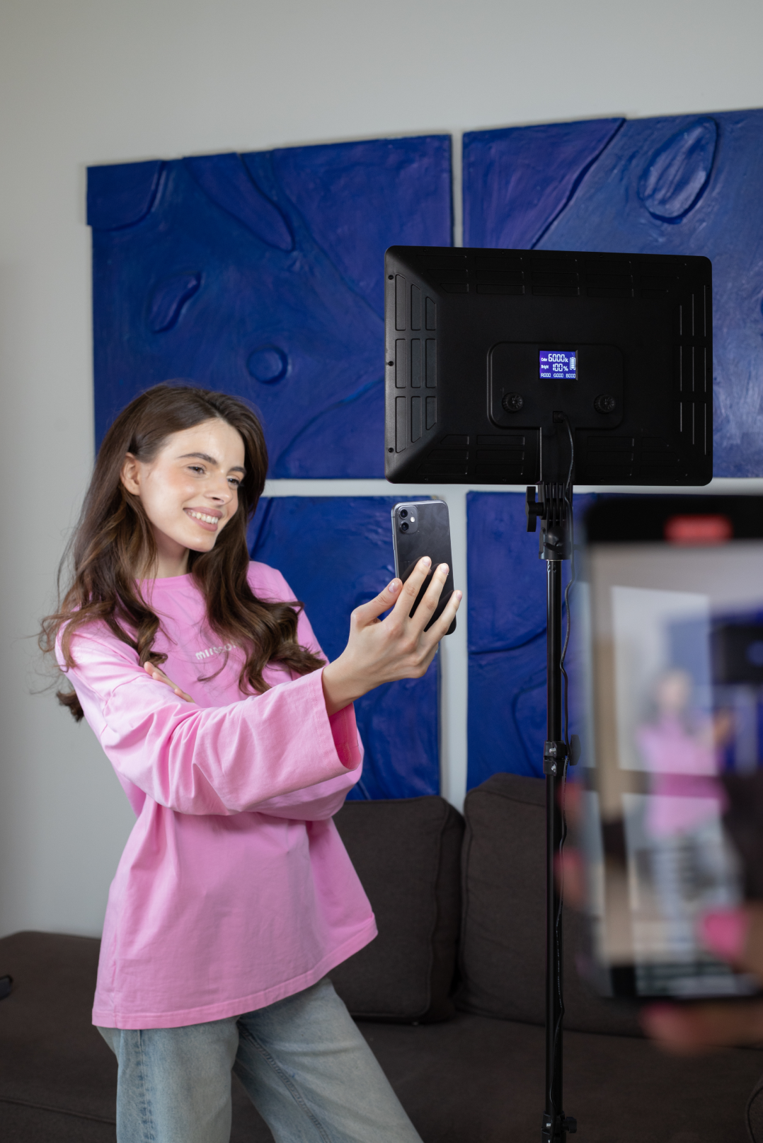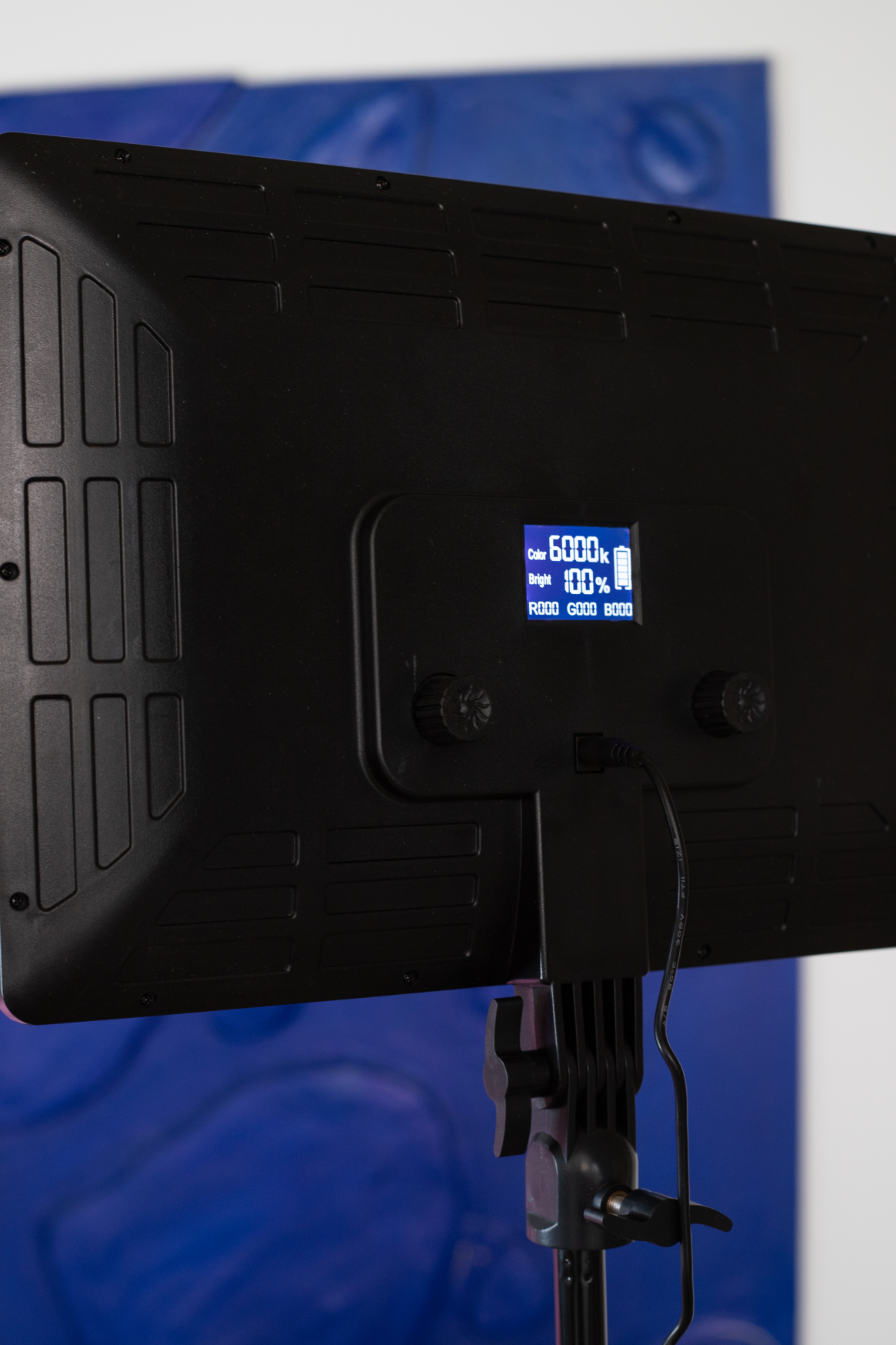 Подключите кабель от адаптера и включите видеосвет. Для настройки параметров используйте пульт, либо диммеры на самой панелли видеосвета